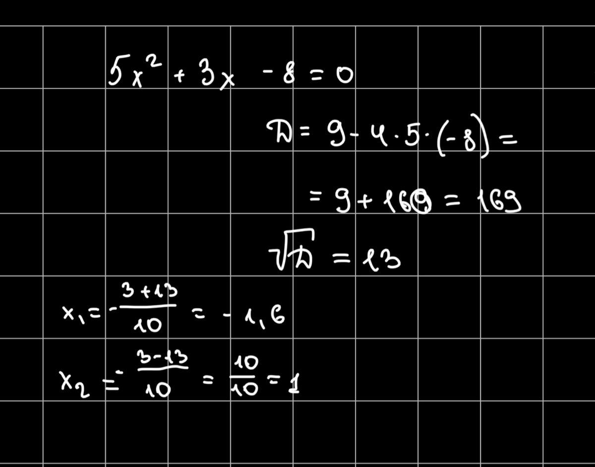 Таким чином, коефіцієнти квадратного рівняння 5x^2 + 3x - 8 = 0 є: