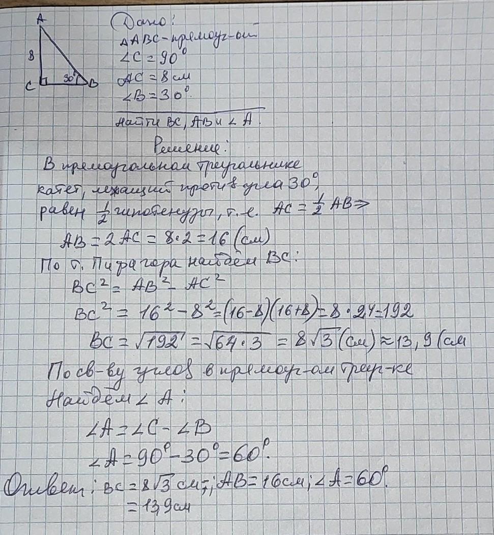 Трикутник АВС - прямокутний (кут С=90о), АС=8 см, кут В=30о. Розв'яжіть цей прямокутний трикутник Відпрвіді округли до десятих