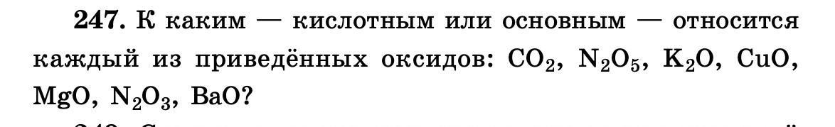 К каким каждый из приведённых оксидов: СО2, N2O5, K2O, CuO, MgO, N2O3, ВаО? кислотным или основнЫМ относится