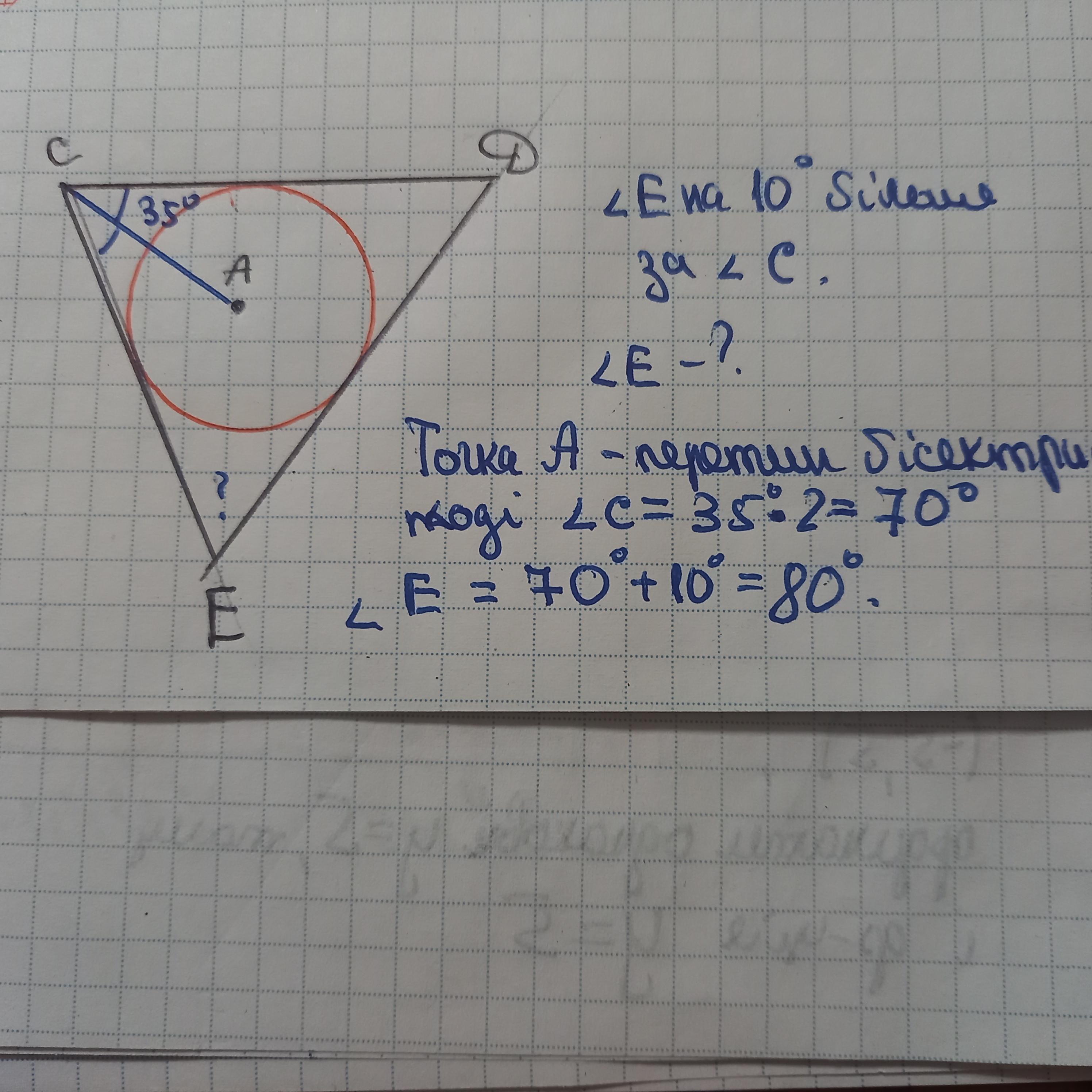 В трикутник СДЕ вписано коло з центром в точці А. Знайти кут Е трикутника, якщо куд АСД дорівнює 35º, а кут Е на 10º більший за кут С трикутника.
