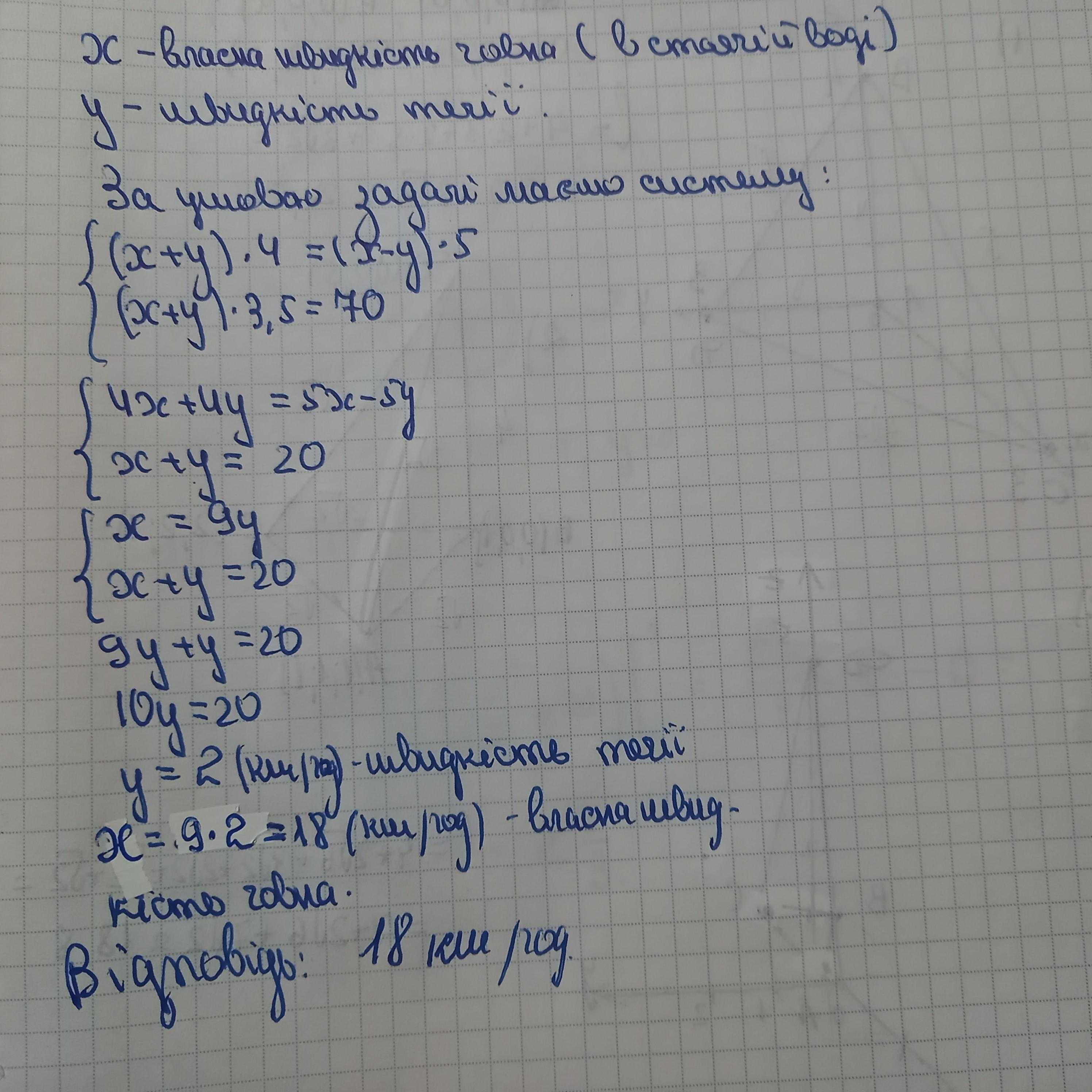 моторний човен за течією річки від однієї пристані до другої проходить за 4 год а зворотний шлях за 5 год .Яка швидкість човна в стоячій воді .Якщо він проходить 70км за течією річки за 3.5год