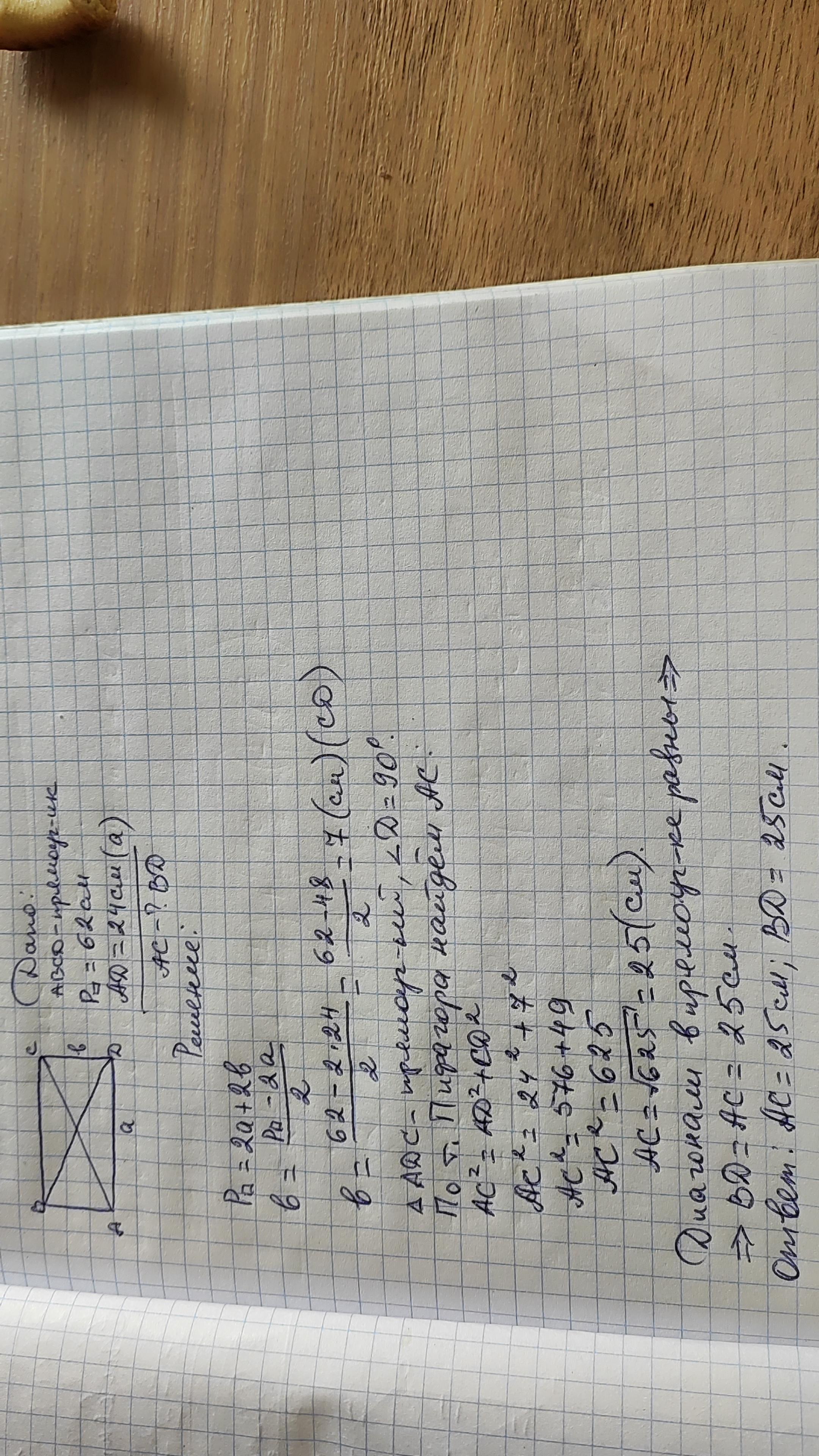 Периметр прямоугольника 62 см, а основание 24 см. Вычислите размер диагонали прямоугольника.