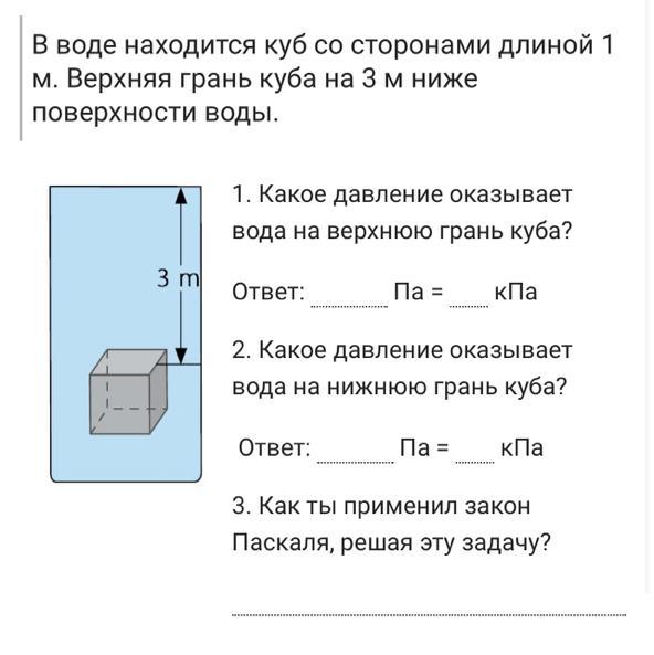 Давление на верхнюю грань куба равно: