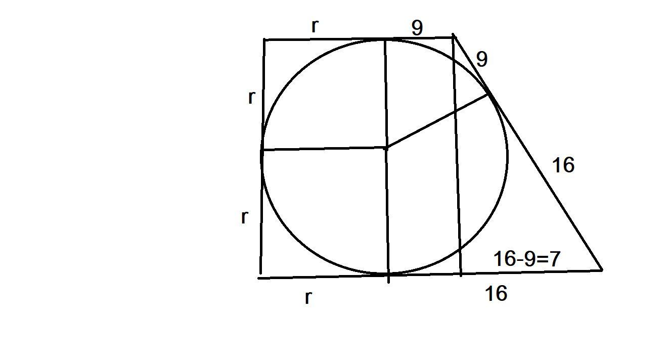 Коло, вписане у прямокутну трапецію, точкою дотику ділить більшубічну сторону на відрізки 9 см і 16 см. Знайти периметр трапеції.