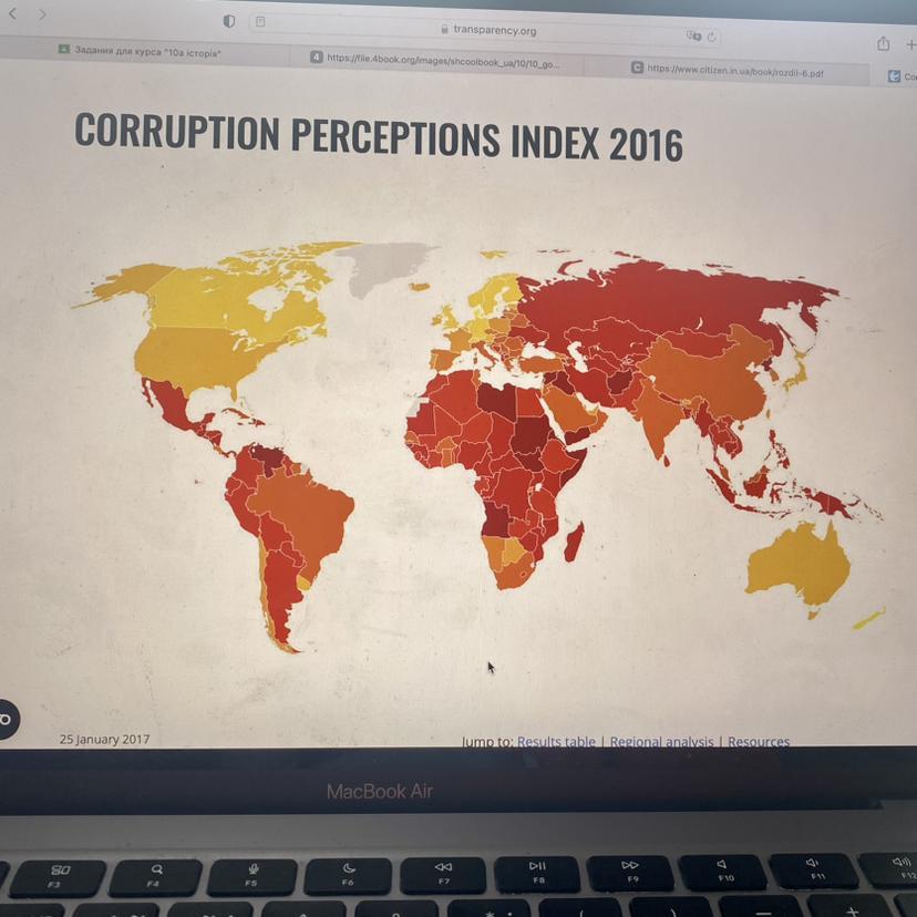 •Про що свідчить запропонована мапа. Знайдіть на мапі Україну изначте, до яких країн по рівню корупції вона належить.