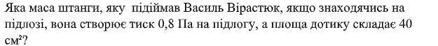 Василий Вирастюк лёжа толкает штангу 225 кг. Очевидно в условии давление 0,8 МПа. Тогда масса штанги 320 кг.
