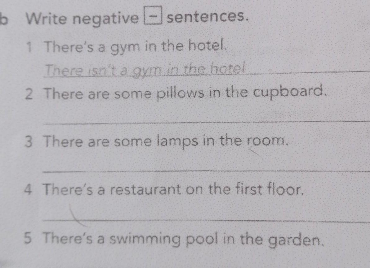 sentences. Write negative 1 There's a gym in the hotel. There isn't a gym in the hotel 2 There are some pillows in the cupboard. 3 There are some lamps in the room. 4 There's a restaurant on the first floor, 5 There's a swimming pool in the garden.
