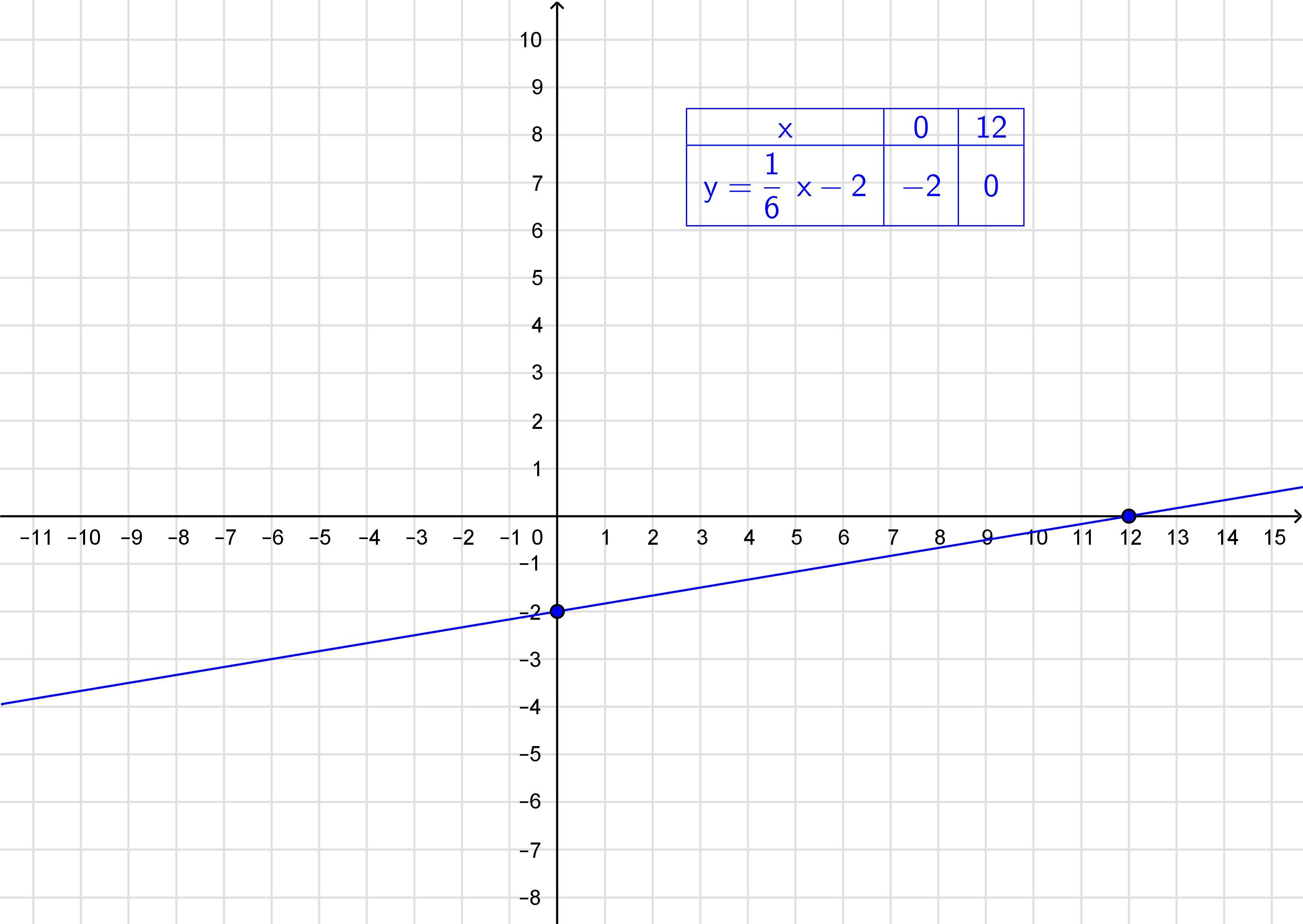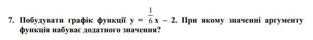 Побудувати графік функції у=1/6х-2. При якому значенні аргументу функція набуває додатного значення?