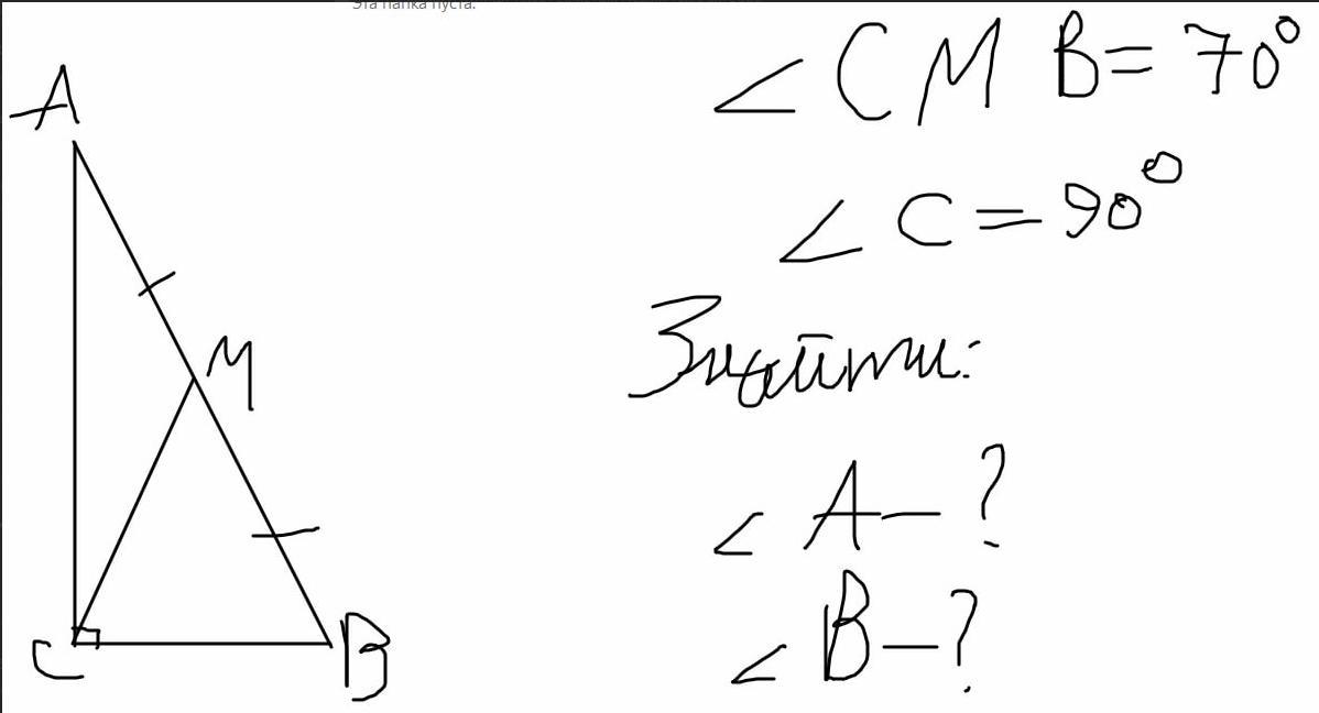 Дано: △АВС(∠С=90°), АМ=МВ, ∠СМВ=70°