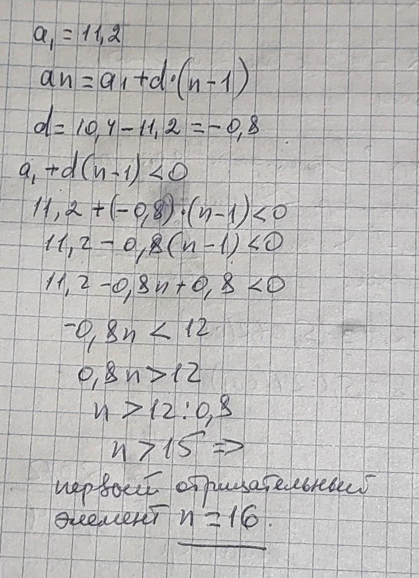 ДАЮ 50 БАЛІВ, ТІЛЬКИ ДОПОМОЖІТЬ МЕНІ, БУДЬ ЛАСКА! З РОЗВ’ЯЗКОМ!!! Який номер має перший від’ємний член арифметичної прогресії 11.2; 10.4; 9.6; ...?