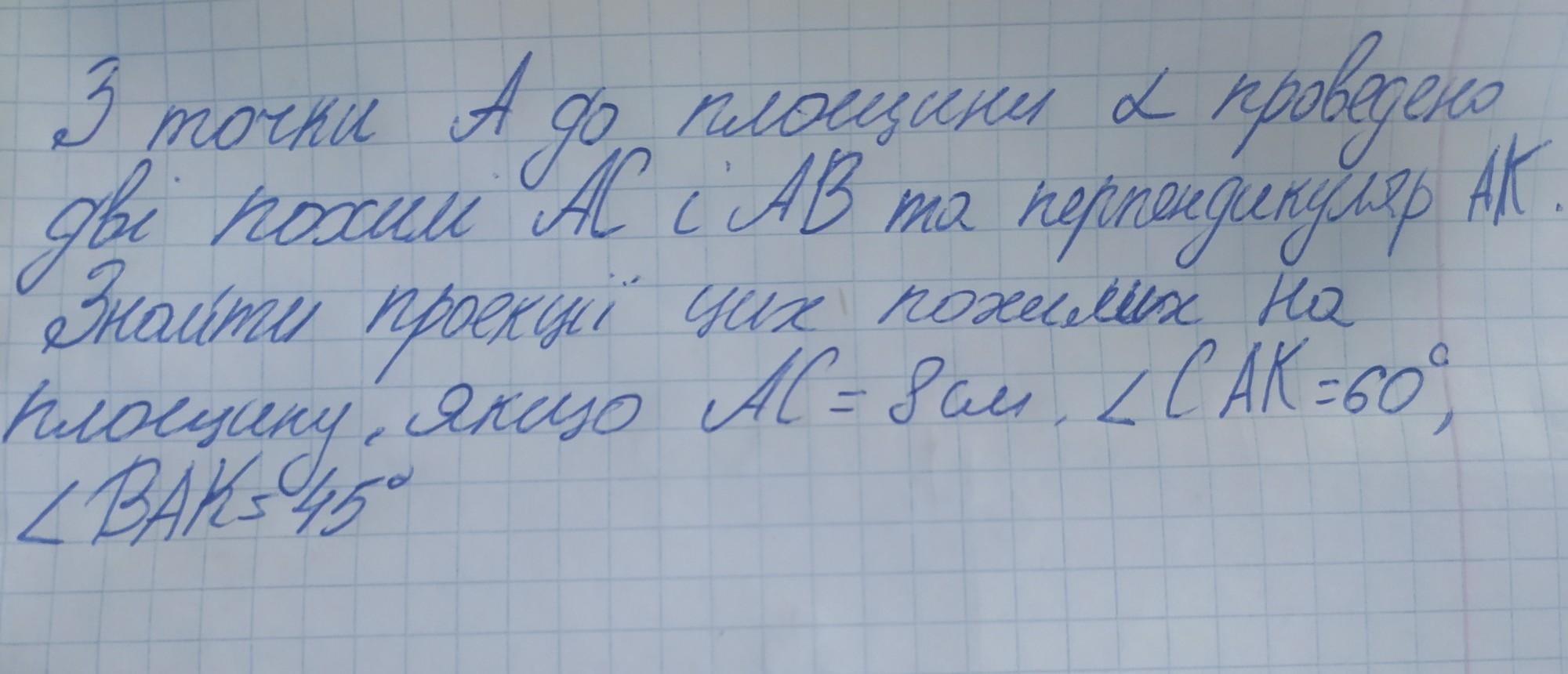 Дано: α- площина , АК⊥α, АС= 8 см, ∠САК=60°, ∠ВАК=45°
