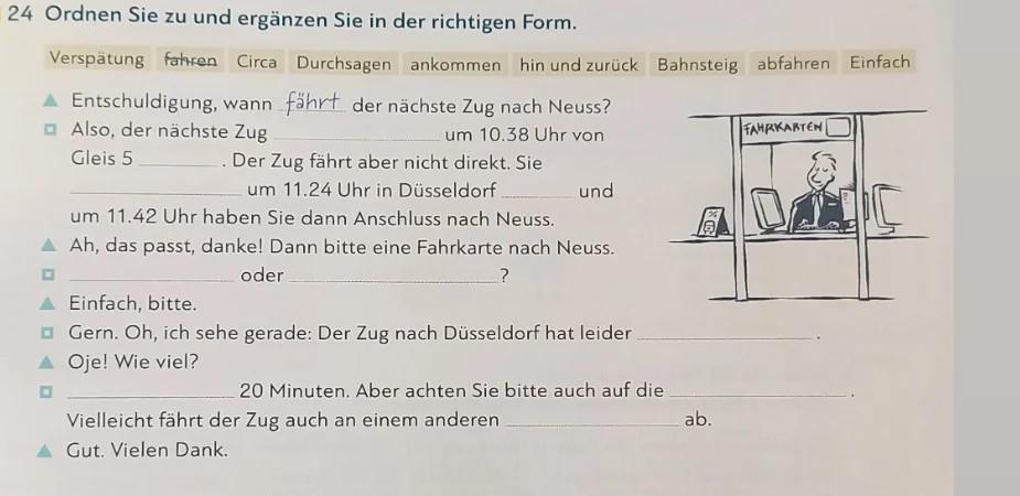 E 24 Ordnen Sie zu und ergänzen Sie in der richtigen Form. Verspätung fahren Circa Durchsagen ankommen hin und zurück Bahnsteig abfahren Einfach ▲ Entschuldigung, wann fährt der nächste Zug nach Neuss? Also, der nächste Zug um 10.38 Uhr von Gleis 5 . Der Zug fährt aber nicht direkt. Sie um 11.24 Uhr in Düsseldorf. um 11.42 Uhr haben Sie dann Anschluss nach Neuss. Ah, das passt, danke! Dann bitte eine Fahrkarte nach Neuss. oder ? und Einfach, bitte. Gern. Oh, ich sehe gerade: Der Zug nach Düsseldorf hat leider Oje! Wie viel? 20 Minuten. Aber achten Sie bitte auch auf die Vielleicht fährt der Zug auch an einem anderen A Gut. Vielen Dank. * ab. FAHRKARTEN