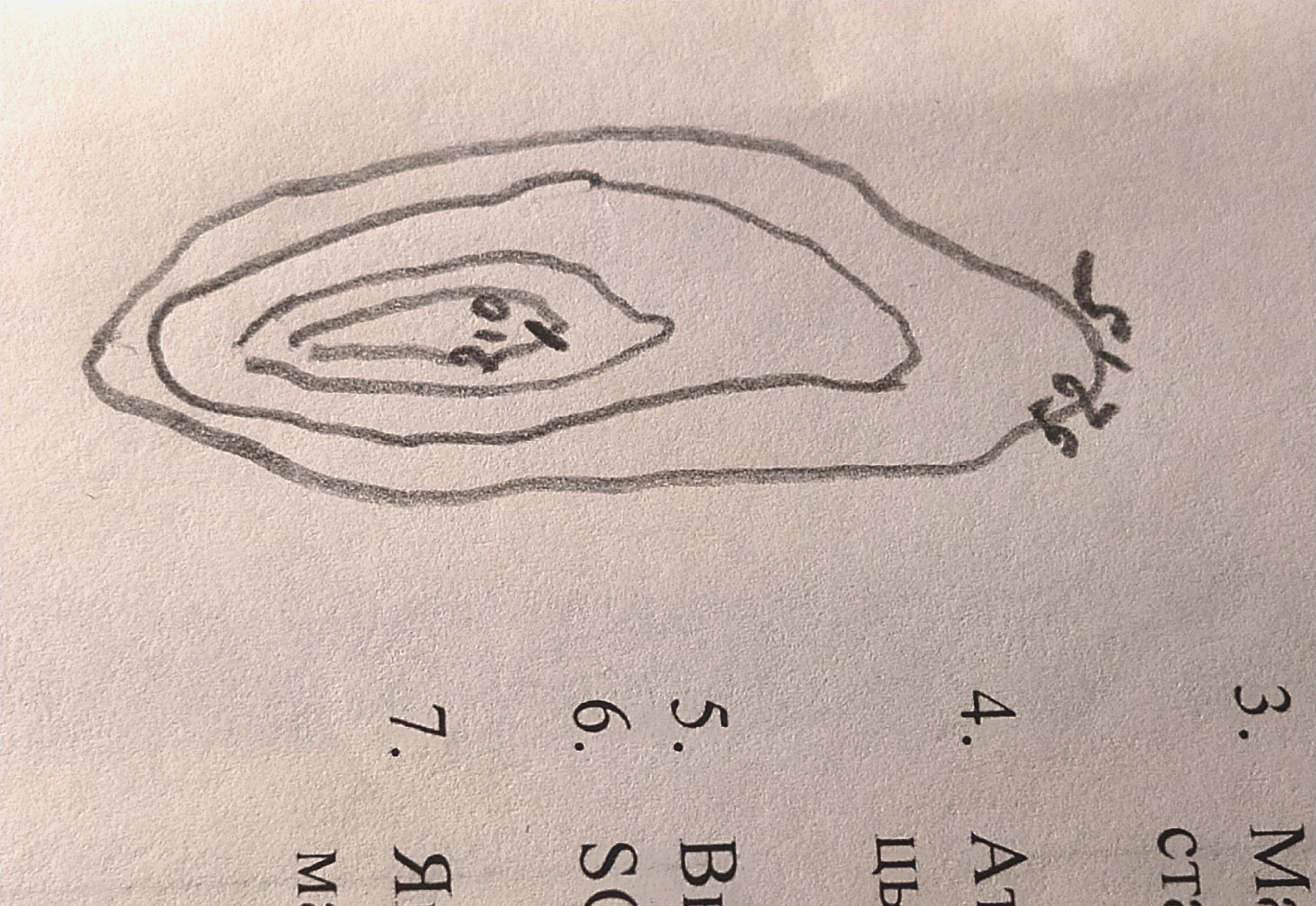10. Зобразіть горизонталями пагорб, з абсолютною висотою 210 м, якщо правий схил– пологий, лівий крутий.