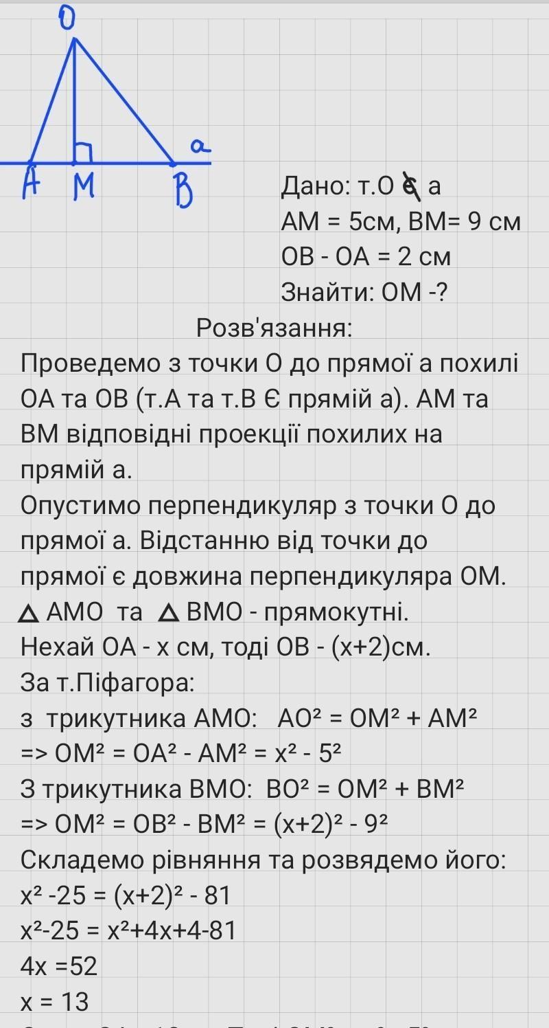 З точки до прямої проведено проекції яких на пряму дорівнюють 5 см і 9 см. Знайдіть відстань від точки до прямої, якщо різниця цих похилих дорівнює 2 см.