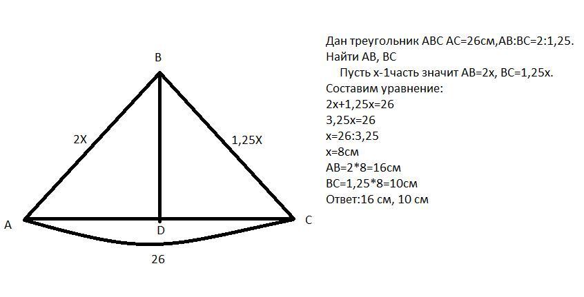 в треугольнике ABC BD является биссектрисой АС=26 см AB : BC как 2: 1.25