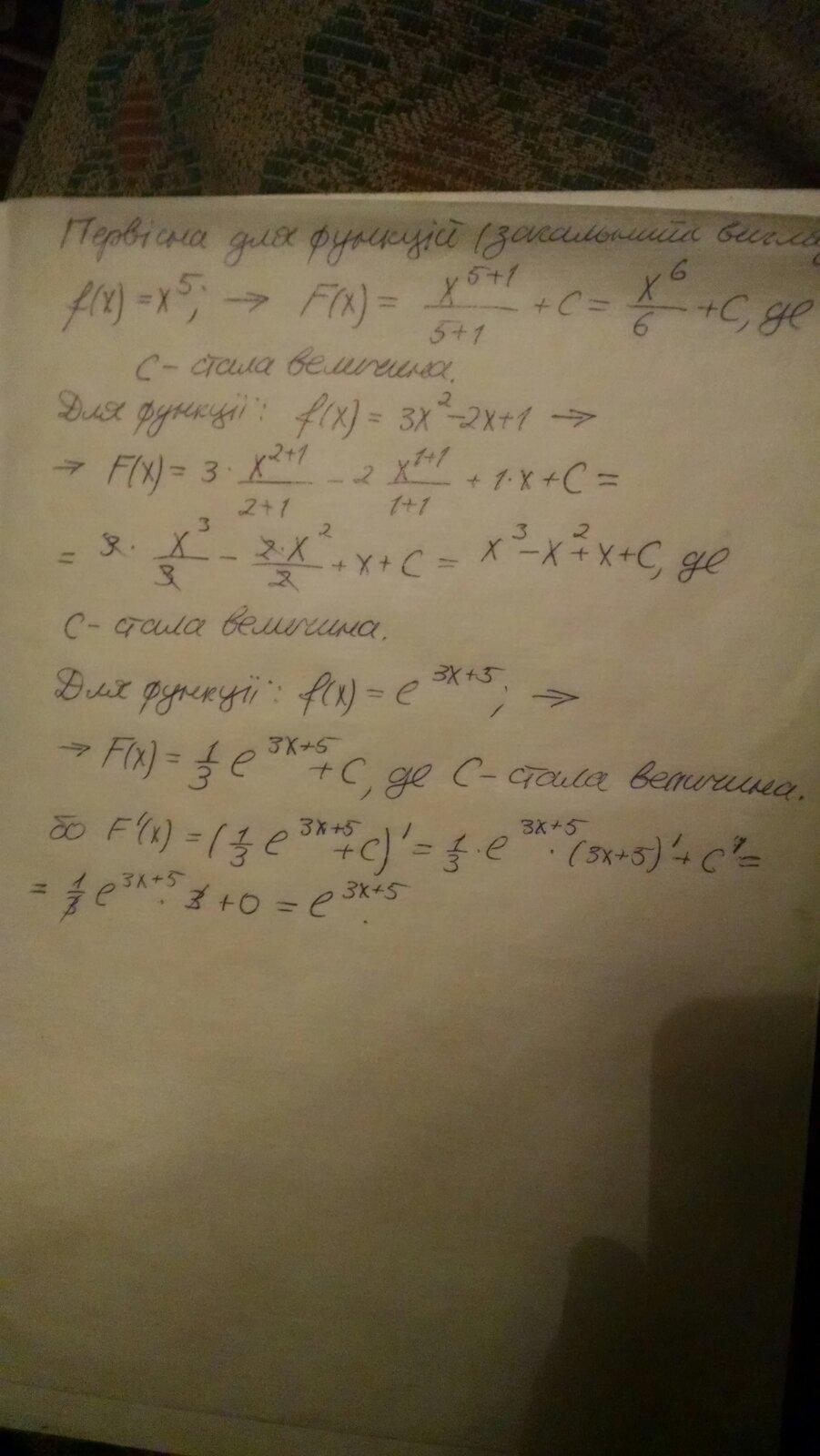 Записати загальний вигляд первісних для заданих функцій: f(x)=x^5; f(x)=1/x^3 ; f(x)=〖3x〗^2-2x+1; f(x)=e^(3x+5).