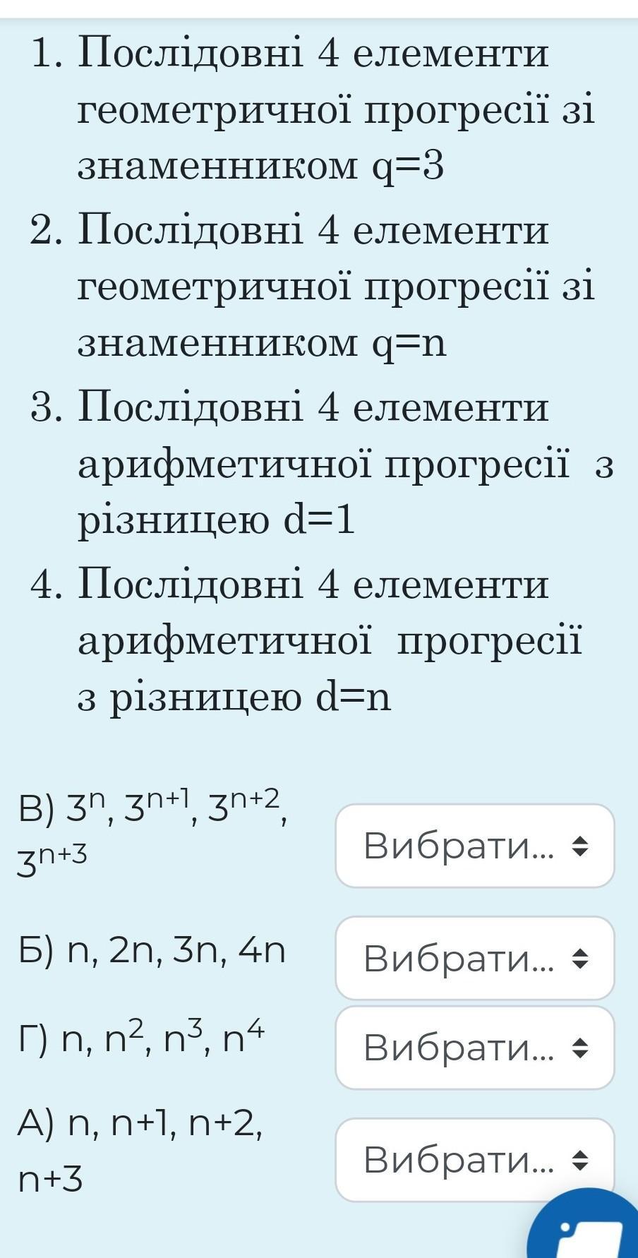Установіть відповідність між означеннями елементів прогресій (1-4) і наборами чисел (А-Г), які можуть бути цими елементами.