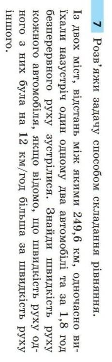 7 Розв'яжи задачу способом складання рівнянн Із двох міст, відстань між якими 249,6 км, одноч їхали назустріч один одному два автомобілі та за безперервного руху зустрілися. Знайди швидкіс кожного автомобіля, якщо відомо, що швидкість ного з них була на 12 км/год бiльша за швидкі іншого.