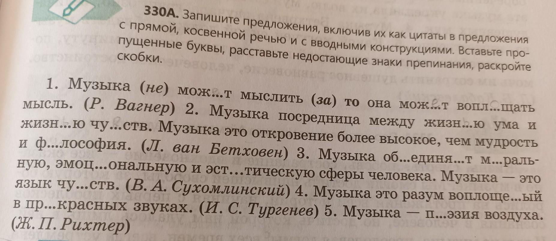 330А. Запишите предложения, включив их как цитаты в предложения с прямой, косвенной речью и с вводными конструкциями. Вставьте про пущенные буквы, расставьте недостающие знаки препинания, раскройте скобки. 1. Музыка (не) мож...т мыслить (за) то она мож...т вопл...щать мысль. (Р. Вагнер) 2. Музыка посредница между жизн...ю ума и жизн...ю чу...ств. Музыка это откровение более высокое, чем мудрость и ф...лософия. (Л. ван Бетховен) 3. Музыка об...единя...т м...раль- ную, эмоц...ональную и эст...тическую сферы человека. Музыка язык чу...ств. (В. А. Сухомлинский) 4. Музыка это разум воплоще...ый - п...эзия воздуха. в пр...красных звуках. (И. С. Тургенев) 5. Музыка (Ж.П. Рихтер) - это