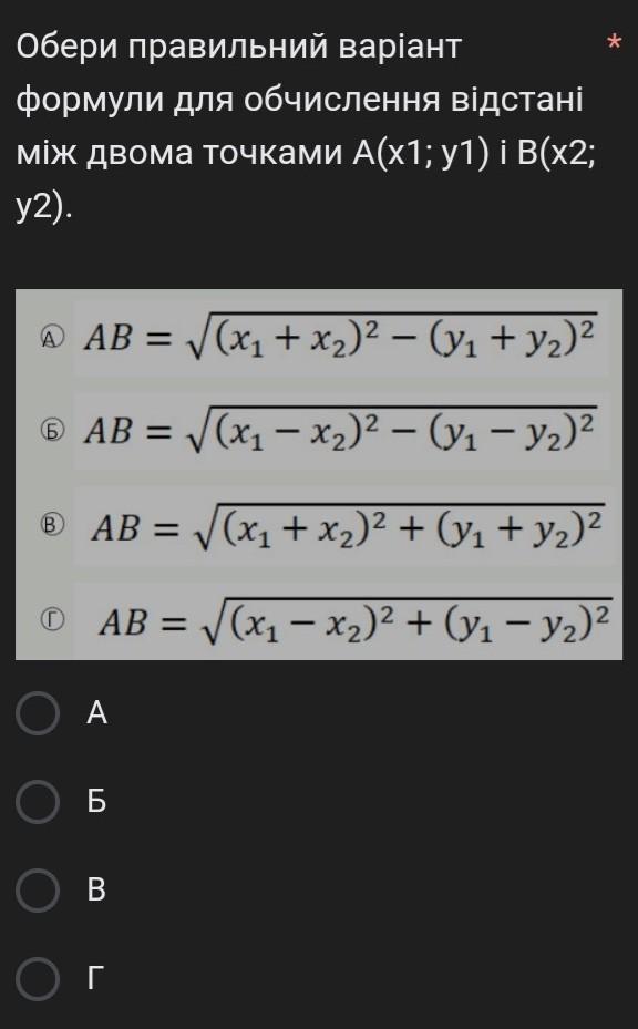ответ Г. AB=√((x1-x2)²+(y1-y2)²).