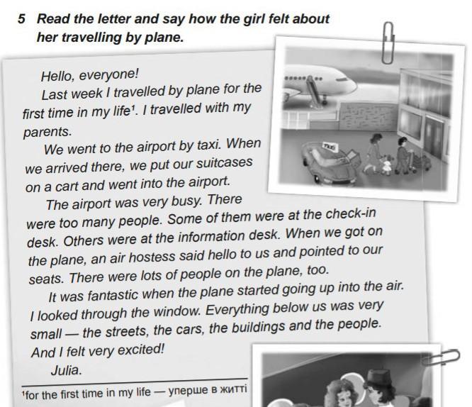 Julia travelled by plane for the first time in her life. she thought that the airport is a big place with too many busy people. however, she found the staff to be very friendly just like the hostess who said hello to them and pointed to their seats. it was so friendly.