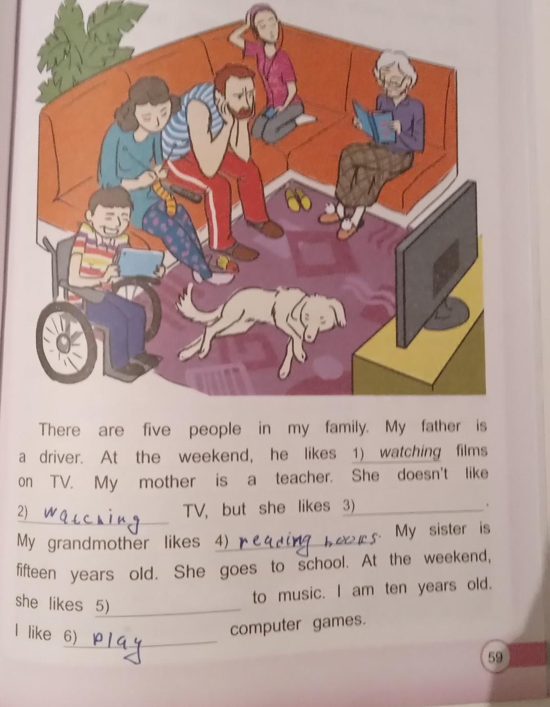 СРОЧНО ДАМ 30 БАЛЛОВ!! There are five people in my family. My father is a driver. At the weekend, he likes 1) watching films on TV. My mother is a teacher. She doesn't like TV, but she likes 3) 2) My grandmother likes 4) reading hours. My sister is fifteen years old. She goes to school. At the weekend, she likes 5) to music. I am ten years old. I like 6) play computer games. СРОЧНО ДАМ 30 БАЛЛОВ