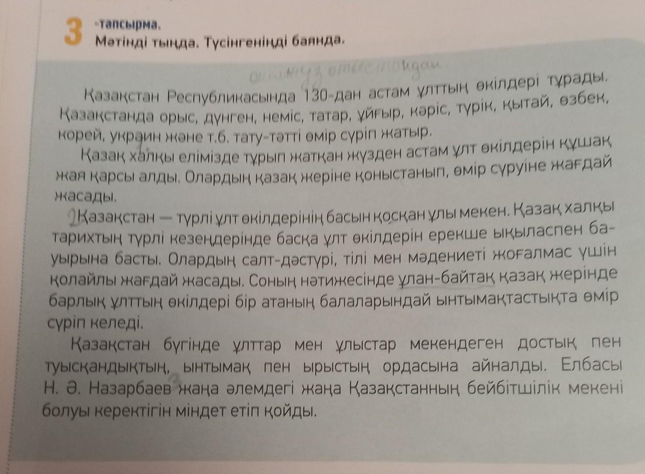 3 -тапсырма. Мәтiндi тыңда. Тусiнгенiңдi баянда. Со ндан Қазақстан Республикасында 130-дан астам ұлттың өкілдері тұрады. Қазақстанда орыс, дүнген, неміс, татар, ұйғыр, кәріс, түрік, қытай, өзбек, корей, украин және т.б. тату-тәтті емiр сүріп жатыр. Қазақ халқы елімізде тұрып жаткан жүзден астам ұлт өкілдерін құшақ жая қарсы алды. Олардың қазақ жерiне коныстанып, өмір сүруiне жағдай жасады. ) Қазақстан - түрлі ұлт өкілдерінің басын коскан ұлы мекен. Қазақ халқы тарихтың түрлі кезеңдерінде басқа ұлт өкiлдерiн ерекше ықыласпен ба- уырына басты. Олардың салт-дәстүрі, тілі мен мәдениеті жоғалмас үшін колайлы жағдай жасады. Соның нәтижесінде улан-байтак казак жерiнде барлық ұлттың өкiлдерi бiр атаның балаларындай ынтымақтастықта өмір суріп келедi. Қазақстан бүгінде ұлттар мен ұлыстар мекендеген достык пен туыскандыктың, ынтымак пен ырыстын ордасына айналды. Елбасы Н. Ә. Назарбаев жана әлемдегі жаңа Қазақстанның бейбітшілік мекені болуы керектігін міндет етiп койды.