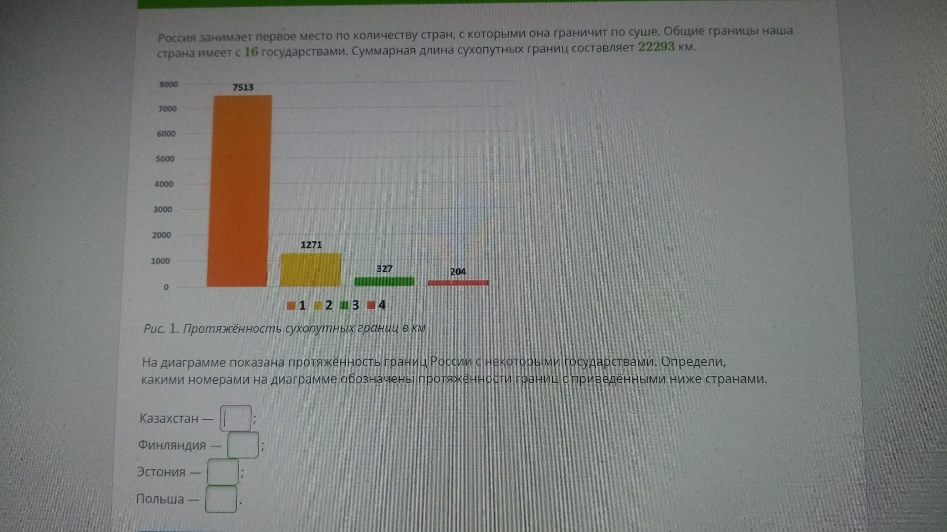Россия занимает первое место по количеству стран, с которыми она граничит по суше. Общие границы наша страна имеет с 16 государствами. Суммарная длина сухопутных границ составляет 22293 км. 8000 7000 6000 5000 4000 3000 2000 1000 О 7513 1271 Казахстан - Финляндия Эстония Польша 327 3 4 Рис. 1. Протяжённость сухопутных границ в км 204 На диаграмме показана протяжённость границ России с некоторыми государствами. Определи, какими номерами на диаграмме обозначены протяженности границ с приведёнными ниже странами.