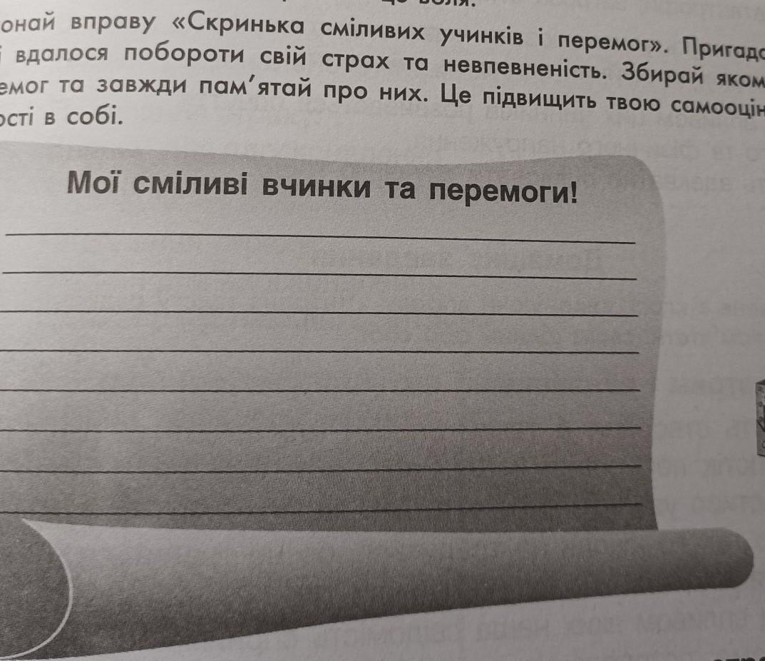 3. Виконай вправу «Скринька сміливих учинків і перемог». Пригадай ситуації, коли тобі вдалося побороти свій страх та невпевненість. Збирай якомога більше своїх перемог та завжди пам'ятай про них. Це підвищить твою самооцінку, додасть упев- неності в собі.