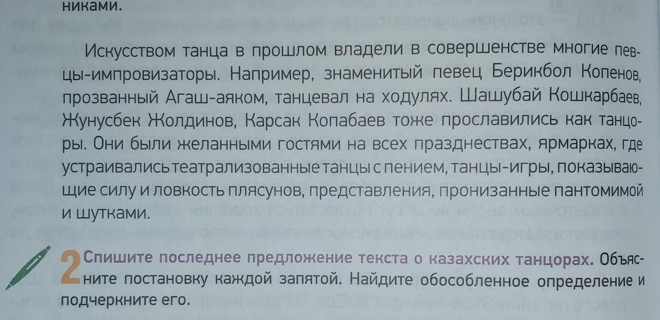 Спишите последнее предложение текста о казахских танцорах. Объясните постановку каждой запятой. Найдите обособленное определение и подчеркните его. Ответ: