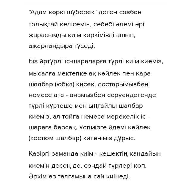 «Ең әдемі киім – ұлтыңның киімі», - деген ұлы адамдар. Қазақ халқының ұлттық киімдерінің түрі де, үлгісі де еш халықтан кем болған жоқ. Оның көркем үлгілері әлемнің этнографиялық мұражайлары мен көрмелерінен орын алған. Ұлт мәдениетінде бағалы киімдер сый-сыяпат, дипломатиялық қатынастарда ескерткіш, белгі ретінде жүрген. Ат, шапан сыйлау құрметтеудің көрінісі деп бағаланған.