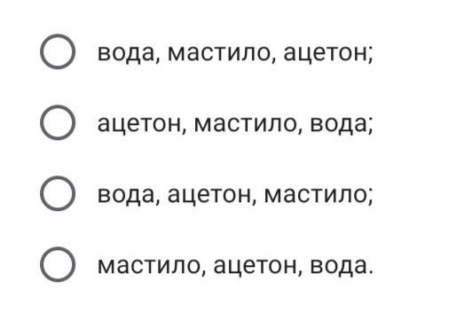 Отже, вода буде на дні, мастило буде на верху, а ацетон буде розміщено між ними.