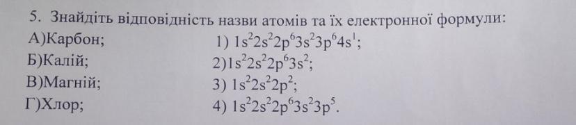 5. Знайдіть повідність назви атомів та їх електронної формули: