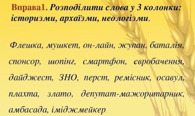 Історизми: мушкет, жупан, баталія, перет, ремісник, плахта, злато, депутат-мажоритарник, амбасада.