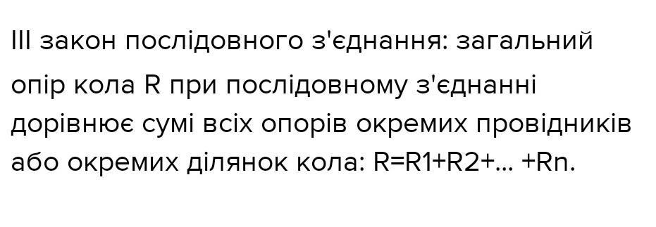 ІІІ закон послідовного з'єднання: загальний опір кола R при послідовному з'єднанні дорівнює сумі всіх опорів окремих провідників або окремих ділянок кола: R=R1+R2+... +Rn.