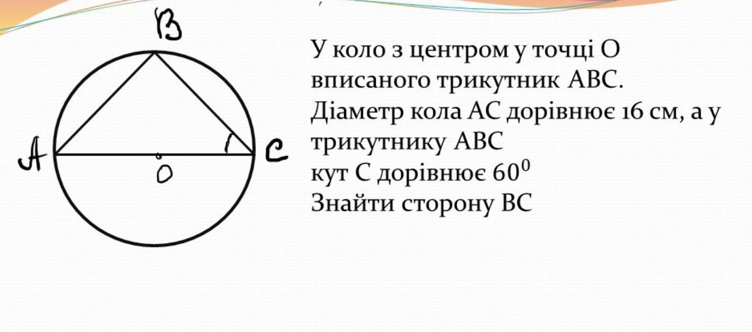 У коло з центром у точці О вписаного трикутник АВС. Діаметр кола АС =16 см, а у трикутнику АВС кут С дорівнює 60 град. Знайти сторону ВС