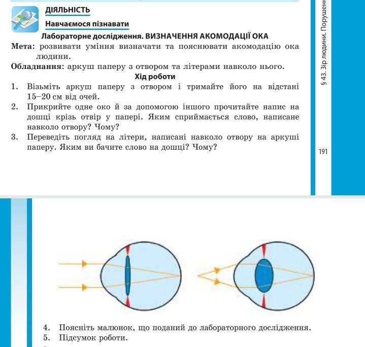 5) Людині для чіткого сприйняття предметів необхідно, щоб їх зображення завжди фокусувалось в центрі сітчатки. Люди можуть чітко розрізняти предмети, які знаходяться на різній відстані від ока, завдяки можливості кришталика змінювати свою кривизну. Властивість ока пристосовуватись до чіткого бачення предметів, які знаходяться на різній відстані, називається акомодацією. З віком людини кришталик втрачає свою еластичність і акомодаційні властивості Ока зменшуються.