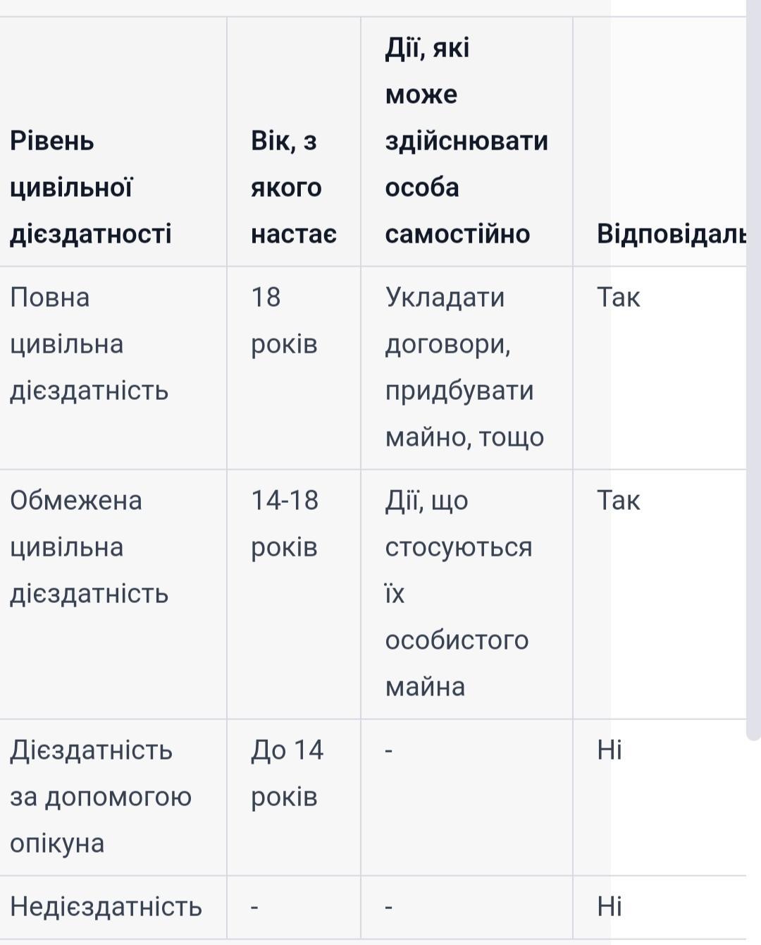 Складіть таблицю “Рівні цивільної дієздатності”. Обов’язково виділіть рівень дієздатності; вік, з якого настає; дії, які особа може здійснювати самостійно; чи несуть відповідальність