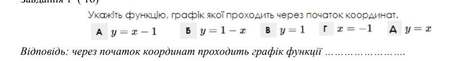 Укажіть функцію, графiк якоï проходить через початок координат. Б у=1-x 1 x=-1 В y=1 A y=x A y=x-1 Відповідь: через початок координат проходить графік функції