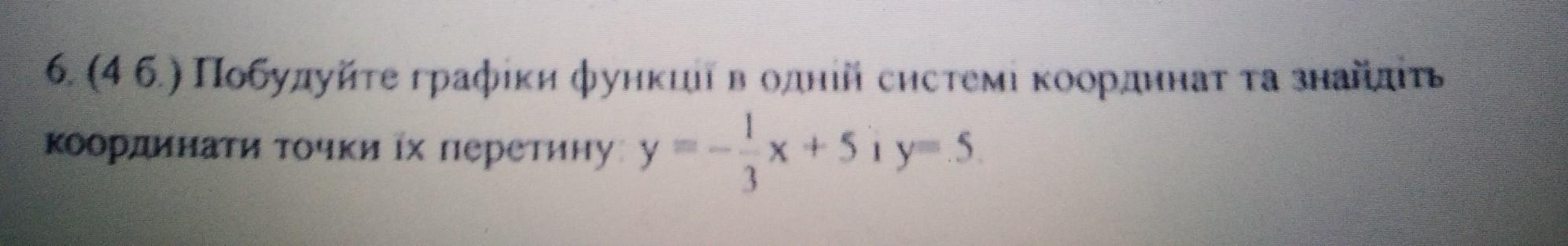 Побудуйте графік функції в одній системі координат та знайдіть координати точок їх перетину у=-1/3х+5 і у=5