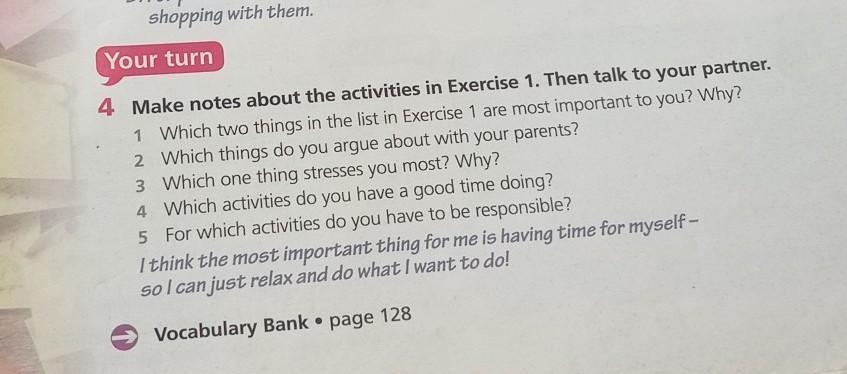 Your turn 4 Make notes about the activities in Exercise 1. Then talk to your partner. Which two things in the list in Exercise 1 are most important to you? Why? Which things do you argue about with your parents? Which one thing stresses you most? Why? 4 Which activities do you have a good time doing? 5 For which activities do you have to be responsible? 1 2 I think the most important thing for me is having time for myself - so I can just relax and do what I want to do! Yocabulary Bank • page 128