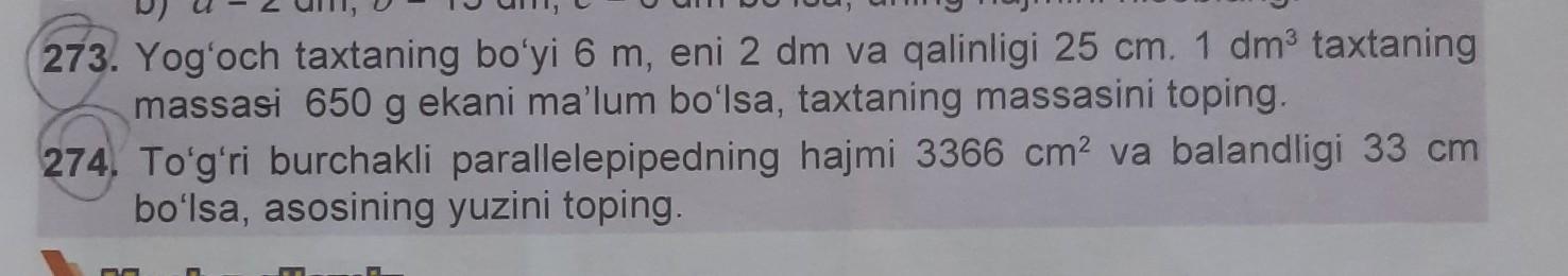 274. To'g'ri burchakli parallelepipedning hajmi 3366 cm² va balandligi 33 cm bo'lsa, asosining yuzini toping.275 nyam iltimoss срочно пожалуйста помогите