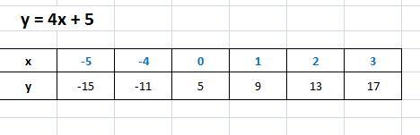 y = 4x + 5 ; D( y ) = { - 15 ; - 11 ; 5 ; 9 ; 13 ; 17 } .