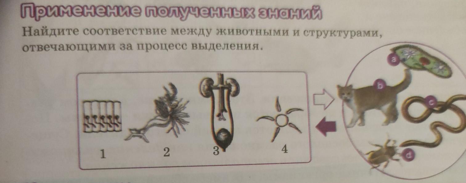 Применение полученных знаний Найдите соответствие между животными и структурами, отвечающими за процесс выделения.