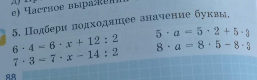 e) Частное выраже 5. Подбери подходящее значение буквы. 5. a=5.2+5.3 8·a=8.5-8-3 6.4 6x + 12: 2 7.3=7 x - 14:2 88