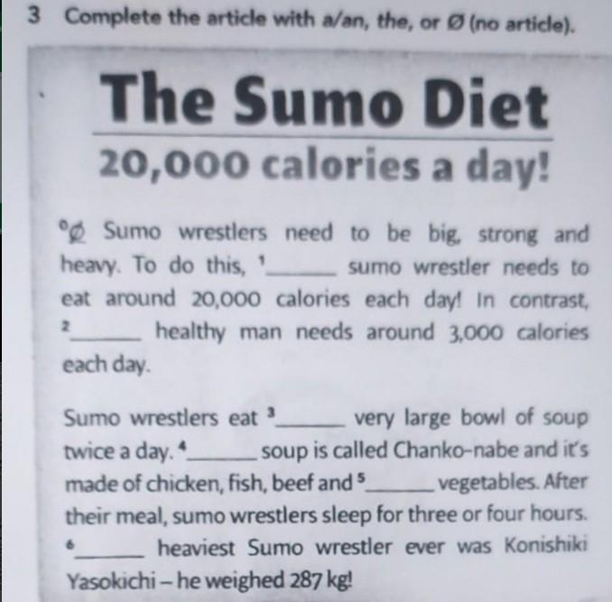 3 Complete the article with a/an, the, or Ø (no article). The Sumo Diet 20,000 calories a day! Sumo wrestlers need to be big, strong and heavy. To do this, 1 sumo wrestler needs to eat around 20,000 calories each day! In contrast, healthy man needs around 3,000 calories 2 each day. Sumo wrestlers eat 2 very large bowl of soup twice a day." soup is called Chanko-nabe and it's vegetables. After made of chicken, fish, beef and 5 their meal, sumo wrestlers sleep for three or four hours. heaviest Sumo wrestler ever was Konishiki Yasokichi-he weighed 287 kg! ОЧЕНЬ СРОЧНО ОЧЕНЬ НУЖНО ПОМОГИТЕ!!!!!!!!