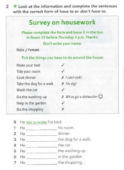 Нужно дополнить предложения, используя конструкцию have/has to do в утвердительной и отрицательной форме.