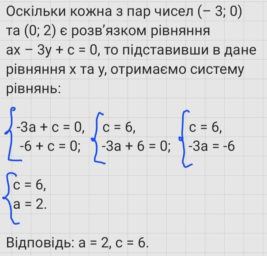 Знайдіть значення коефіцієнта а та с в рівнянні ах – 3у + с = 0 , якщо відомо, що кожна з пар чисел (– 3; 0) та (0; 2) є розв’язком рівняння.
