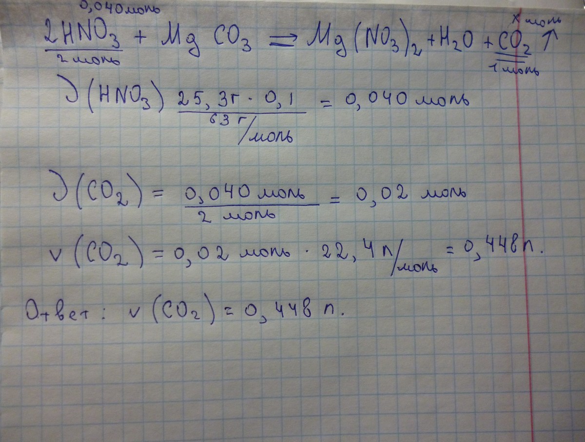 Раствор азотной кислоты массой 25, 3 г и w= 10% прилили к избытку карбоната магния. Вычислите объем выделившегося углекислого газа.