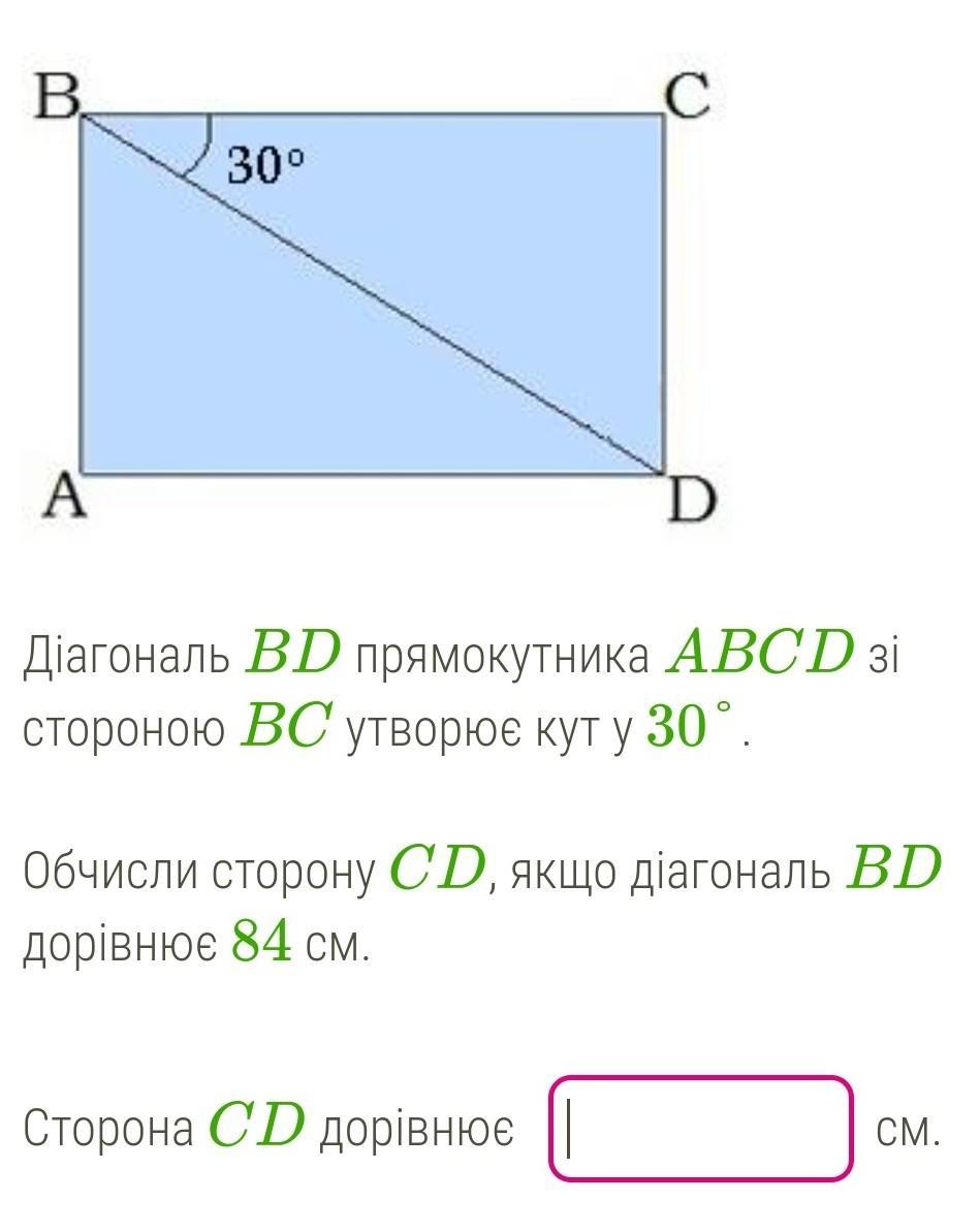 Діагональ BD прямокутника ABCD зі стороною BC утворює кут у 30°.